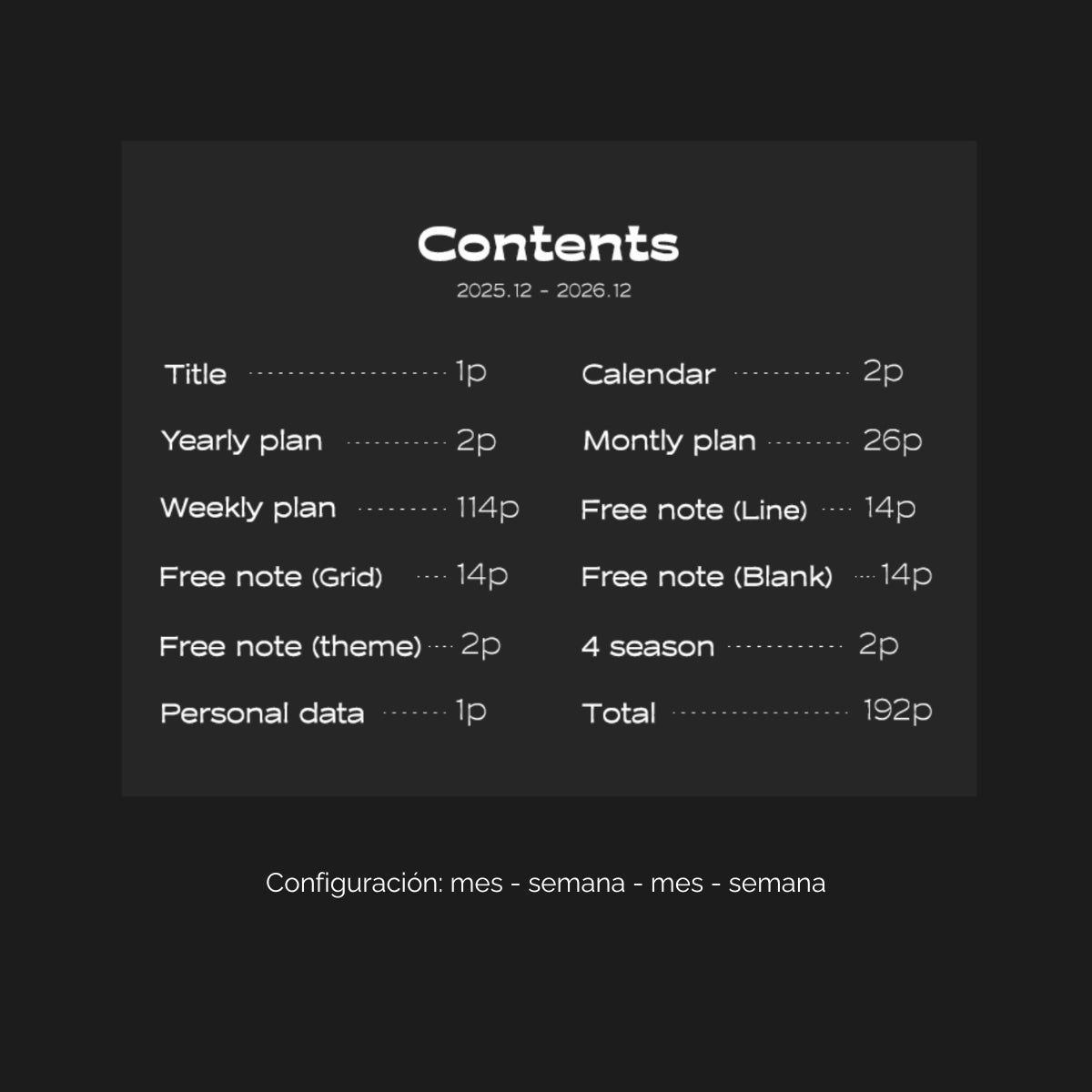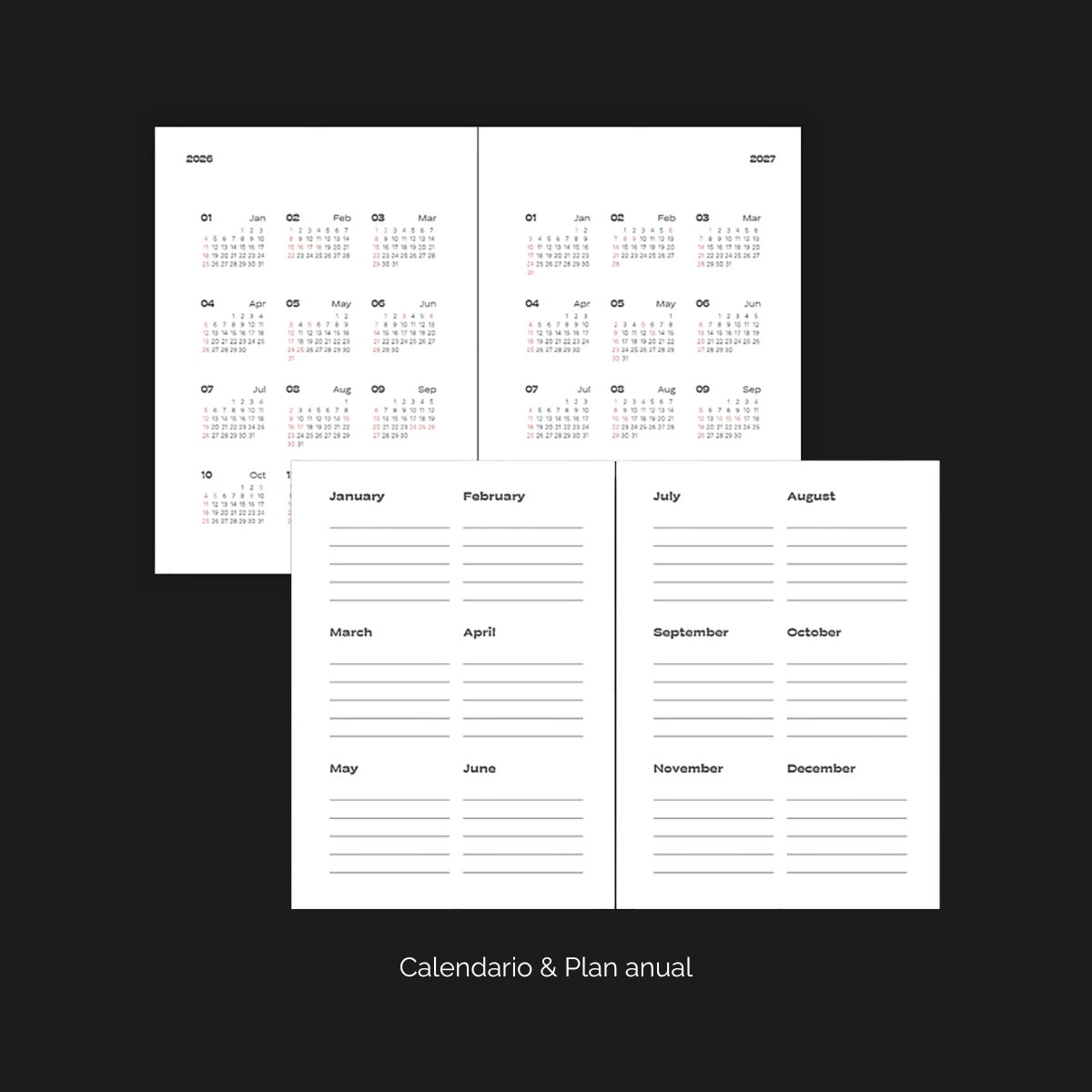 Diseñada con una encuadernación de tapa dura resistente, papel de 120 g/m² que evita filtraciones y detalles funcionales como marcador de cinta y separador plástico semitransparente, esta agenda datada de 2026 te acompaña durante todo el año. Sus páginas incluyen un calendario anual para objetivos importantes, una planificación semanal con espacio generoso para cada día, secciones de notas (cuadriculadas y en blanco), y hojas especiales para capturar recuerdos por estación. Perfecta para quienes buscan una herramienta elegante, versátil y con alma, que eleve cada página de su rutina diaria.