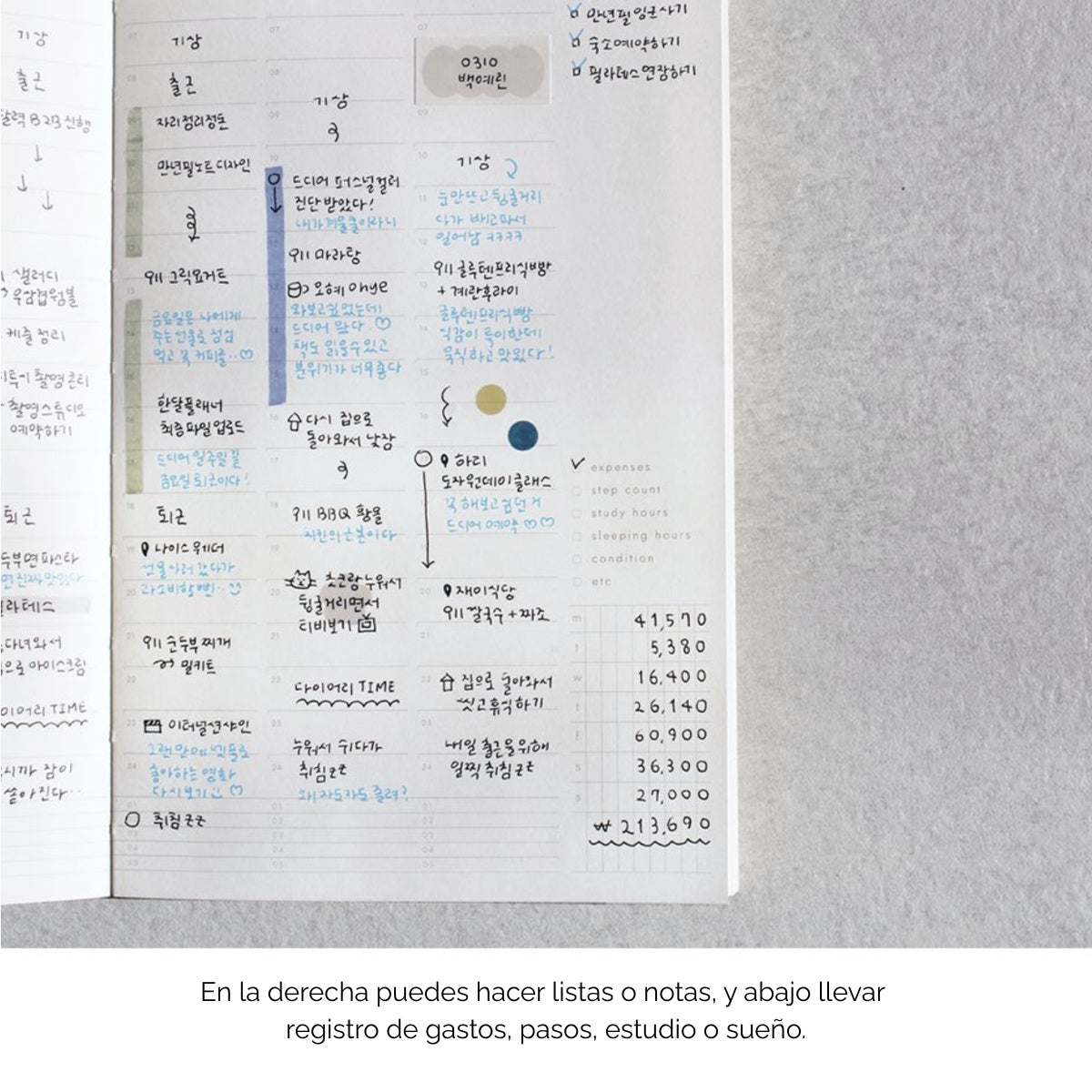 En las páginas semanales disfrutarás de espacio para tu horario diario, un área de checklist y notas libres al lado, y una sección inferior donde registrar gastos, pasos, horas de estudio y sueño. Cuenta también con un tracker de hábitos (hasta 5 al mes) y una sección de archivo para capturar libros, películas, música o lugares que marcaron tu memoria. Todo esto bajo una práctica cubierta de PVC personalizable, ideal para proteger tu agenda mientras le das tu toque único. Maxima tu productividad, organiza tus días con claridad y lleva tu rutina al siguiente nivel.