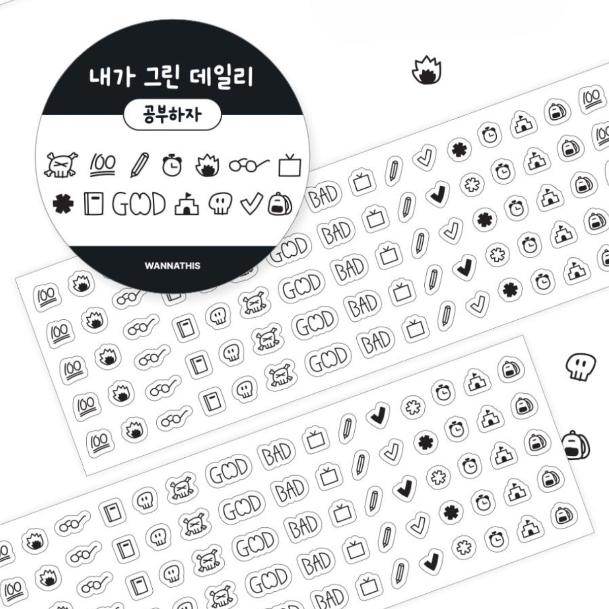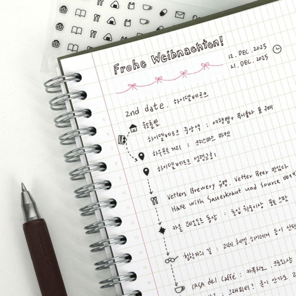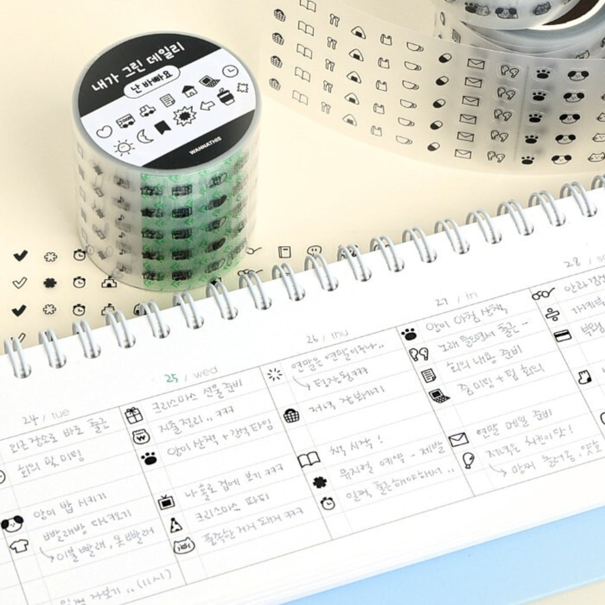 Elige entre tres colecciones temáticas —Busy, Home y Study— todas con dibujos pequeños, adorables y fácilmente combinables, sin sobresaturar tu página. Su diseño funcional te permite pegar rápido lo necesario, sin complicaciones. Esta cinta se adapta tanto a lo práctico como a lo decorativo: úsala para completar listas, embellecer portadas o relatar días enteros con apenas unos toques minimalistas.