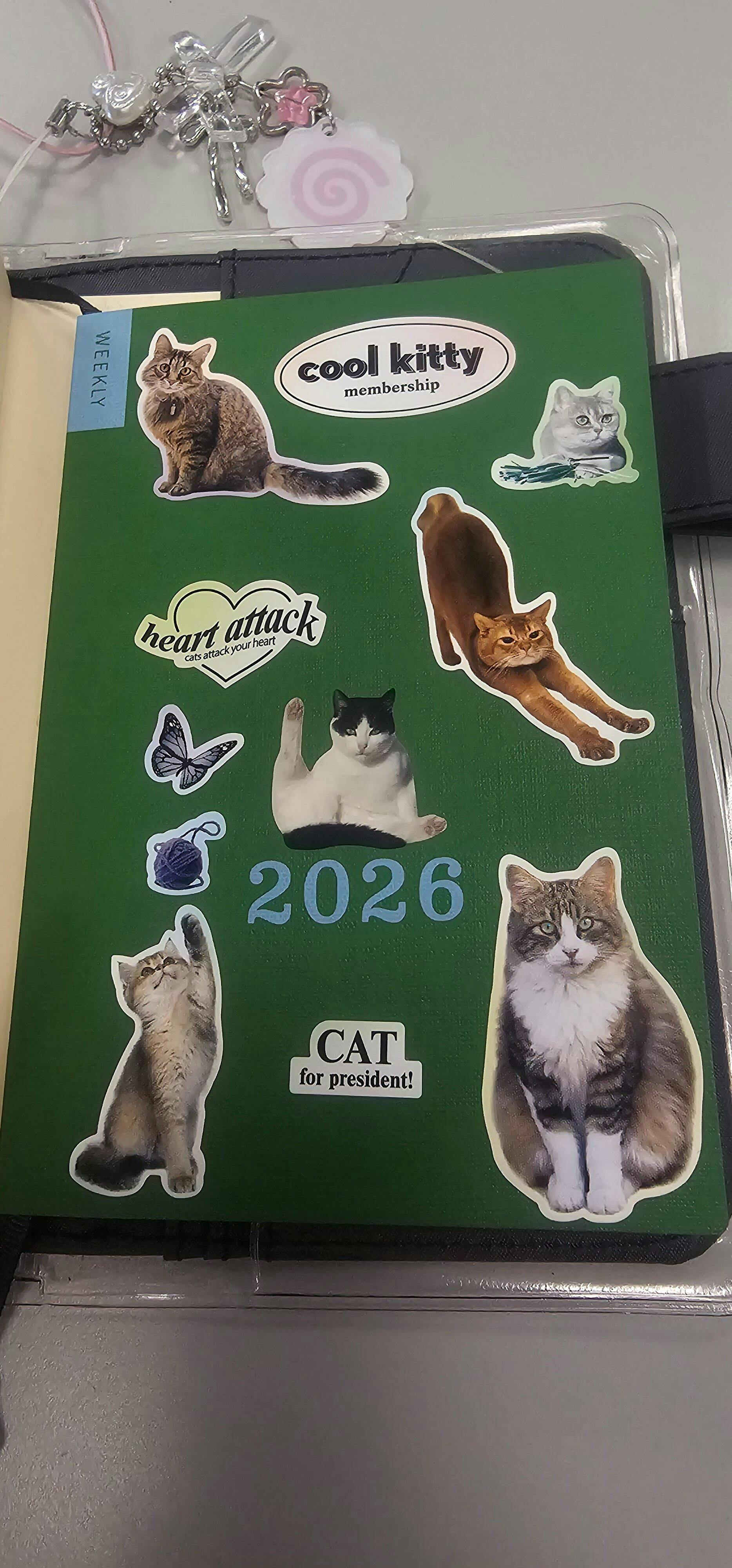 A veces me cuesta trabajo decidir qué escribir y he encontrado que los stickers, ya sea por sus colores o temáticas desbloquean mi miedo a la hoja en blanco y hacen más fácil que registre aquellas cosas que me inspiran, que me obsesionan, que dialogan conmigo
